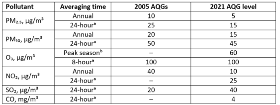Recommended 2021 AQG levels compared to 2005 air quality guidelines.